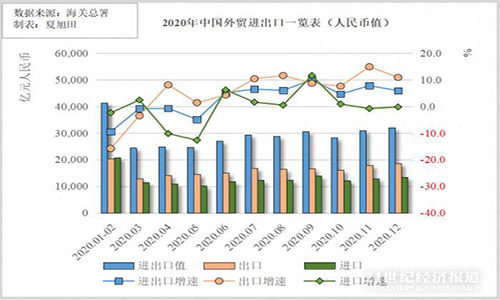 李魁文指出,2020年,世界經(jīng)濟增長和全球貿(mào)易遭受嚴重沖擊,我國外貿(mào)發(fā)展外部環(huán)境復雜嚴峻,在這樣困難的情況下,我國外貿(mào)進出口實現(xiàn)了快速回穩(wěn)、持續(xù)向好,展現(xiàn)了強大的韌性和綜合競爭力。我國外貿(mào)進出口從2020年6月份起連續(xù)7個月實現(xiàn)正增長,全年進出口、出口總值雙雙創(chuàng)歷史新高,國際市場份額也創(chuàng)歷史最好紀錄,成為全球唯一實現(xiàn)貨物貿(mào)易正增長的主要經(jīng)濟體,貨物貿(mào)易第一大國地位進一步鞏固。〖查看詳細〗