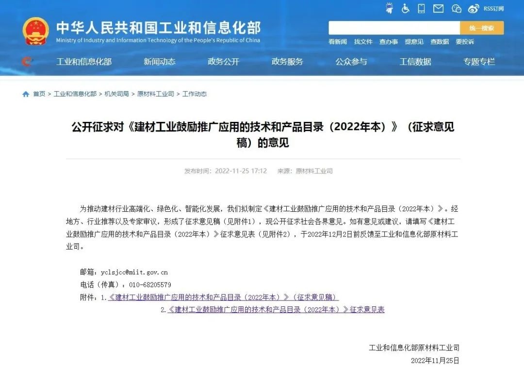 11月25日,工信部發布《建材工業鼓勵推廣應用的技術和產品目錄(2022年本)》(征求意見稿),公開征求社會各界意見。 公開征求對《建材工業鼓勵推廣應用的技術和產品目錄(2022年本)》(征〖查看詳細〗